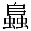 音种。【說文】从三虫,象形。凡蟲之屬皆从蟲。【大戴禮】有羽之蟲三百六十,而鳳凰爲之長。有毛之蟲三百六十,而麒麟爲之長。有甲之蟲三百六十,而神龜爲之長。有鱗之蟲三百六十,而蛟龍爲之長。有倮之蟲三百六十,而聖人爲之長。【爾雅·釋蟲】有足謂之蟲,無足謂之豸。【周禮·冬官考工記·梓人】外骨內骨,郤行仄行,連行紆行,以脰鳴者,以注鳴者,以旁鳴者,以翼鳴者,以股鳴者,以胷鳴者,謂之小蟲之屬,以爲雕琢。【大戴禮】二九十八,八主風,風主蟲。故蟲八月化也。【荀子·勸學篇】肉腐出蟲。