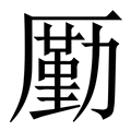 廑, 拼音为jǐn,qín, 笔画为14画, 部首为广, unicode编码5ED1, 汉语字典解释:1、 同“仅1”。 ,1、 同“勤”。