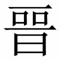 晉, 拼音为jìn, 笔画为10画, 部首为日, unicode编码6649, 造字法为會意。小篆字形,從日。指追着太陽一直前進, 本义为上進, 汉语字典解释:1、 進。如:晉京;晉謁。《爾雅•釋詁下》:「晉,進也。」 2、 升,升級。如:晉級。《清史稿•桂中行傳》:「以功晉知府。」 3、 六十四卦之一。卦形為䷢,坤下離上。《易•晉》:「晉,康侯用錫馬蕃庶,晝日三接。」 4、 內;裡面。《韓非子•外儲説左下》:「孟獻伯相魯,……食不二味,坐不重席,晉無衣帛之妾,居不粟馬,出不從車。」 5、 抑制;按捺。《周禮•夏官•田僕》:「凡田,王提馬而走,諸侯晉,大夫馳。」 6、 俯,低。《尚書大傳》卷四:「(伯禽、康叔)見橋木高而仰,梓木晉而俯,反以告商子。商子曰:『橋者父道也,梓者子道也。』」 7、 通「搢」。插。《周禮•春官•典瑞》:「王晉大圭,執鎮圭。」 8、 通「鐏」。戈柄下端圓錐形的金屬套,可以插入地中。《周禮•考工記•廬人