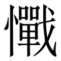 , 拼音为chàn,zhàn, 笔画为19画, 部首为忄, unicode编码22947, 汉语字典解释:同【颤】。,越南汉字读音chán讨厌,厌烦,烦腻。