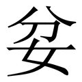 , 笔画为7画, 部首为女, unicode编码216D1, 汉语字典解释:【坌】的讹字。