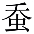 蠶, 拼音为cán, 笔画为24画, 部首为虫, unicode编码8836, 汉语字典解释:1、 蚕蛾科和天蚕科昆虫的通称。幼虫能吐丝结茧。茧丝可用作纤维资源。如:家蚕;柞蚕;蓖麻蚕。《説文•䖵部》,蠶,任絲也。”《詩•魏風•碩鼠序》:“國人刺其君重歛蠶食於民,不脩其政,貪而畏人。”孔穎達疏:“蠶食者,蠶之食桑,漸漸以食,使桑盡也。”南朝宋鮑照《幽蘭五首》之四:“吵眇蛸挂網,漠漠蠶弄絲。” 2、 养蚕。《書•禹貢》“桑土既蠶。”孔穎達疏:“宜桑之土,既得桑養蠶矣。”《晋書•慕容皝載記》:“其耕而食,蠶而衣,亦天之道也。”唐李白《公無渡河》:“殺湍湮洪水,九州始蠶麻。” ,【蚕】的繁体。