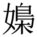 , 拼音为niǎo, 笔画为14画, 部首为女, unicode编码2183F, 汉语字典解释:,同【袅】。