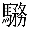 骛, 拼音为wù, 笔画为12画, 部首为马, unicode编码9A9B, 造字法为形声:下形上声, 本义为纵横奔驰, 汉语字典解释:1、 乱跑,奔驰:~望(放眼远望)。~骤(急速,急骤)。 2、 同“务”。