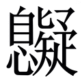 疑, 拼音为yí,nǐ, 笔画为14画, 部首为疋, unicode编码7591, 造字法为形声:从予、止匕、矢声, 本义为怀疑, 汉语字典解释:1、 不信,猜度(duó):~惑。~问。~心。~团。~虑。~窦。~点。~端。猜~。怀~。半信半~。 2、 不能解决的,不能断定的:~案。~难。~义。存~。 ,1、 安定,止息。 2、 同“拟”,比拟。