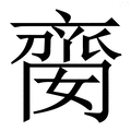 , 拼音为zī, 笔画为20画, 部首为齊, unicode编码2A5CB, 汉语字典解释:1、 同“”。下衣的鎖邊。見《說文•衣部》。又特指喪服下部折轉的邊。《荀子•大略》:“父母之喪,三年不事;喪大功,三月不事。” 2、 長衣的下縫。《漢書•朱雲傳》:“有薦去者召入,攝登堂,抗首而請,音動左右。”顏師古注:“,衣下之裳。” ,同【】。