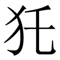 狂, 拼音为kuáng, 笔画为7画, 部首为犭, unicode编码72C2, 造字法为形声:从犭、王声, 本义为狗发疯, 汉语字典解释:1、 本称狗发疯,后亦指人精神失常:~犬。疯~。癫~。发~。~人。 2、 纵情任性或放荡骄恣的态度:轻~。~妄(极端自高自大)。~吠(狗狂叫,借指疯狂的叫嚣)。~乱。~野。~躁。~恣。~草(草书的一种,风格狂放无羁)。 3、 气势猛烈,超出常度:~风。~飙。~热。力挽~澜。