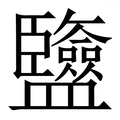 , 拼音为jiǎn, 笔画为25画, 部首为皿, unicode编码250E1, 汉语字典解释:同【碱】。
