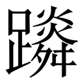 蹸, 拼音为lìn, 笔画为19画, 部首为足, unicode编码8E78, 汉语字典解释:1、 車輪碾過。《説文•足部》:“,轢也。”《玉篇•足部》:“蹸,轢也,車踐也。” 2、 同“躪”。踐踏。《後漢書•班彪傳附班固》:“蹂蹸其十二三,乃拗怒而少息。” 3、 行貌。《集韻•準韻》:“蹸,行皃。” ,1、 〔蹸蹸〕行貌。《集韻•真韻》:“蹸,蹸蹸,行皃。”