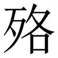 , 拼音为luò, 笔画为10画, 部首为歹, unicode编码239F3, 汉语字典解释:①死亡。②同【落①】。零落。